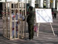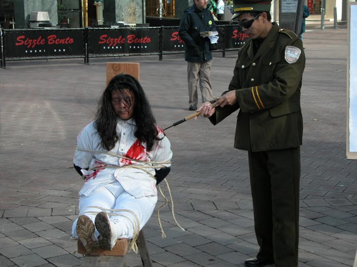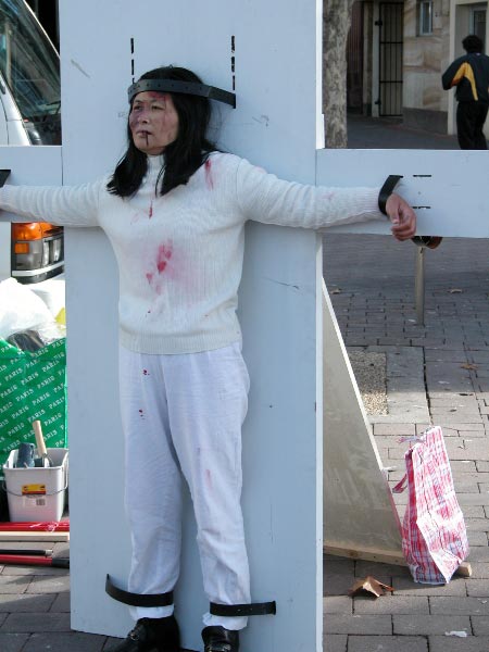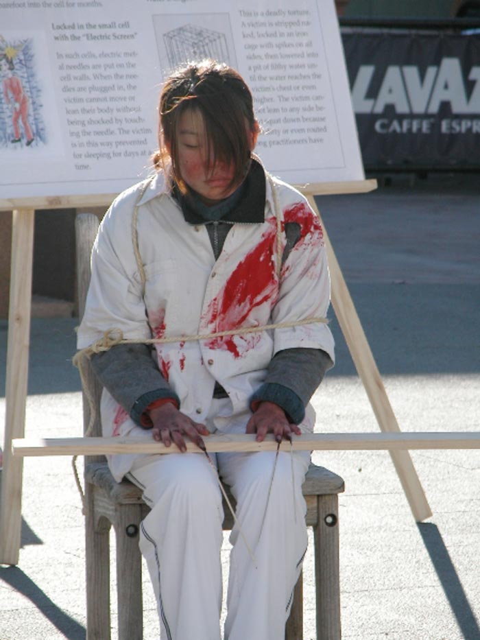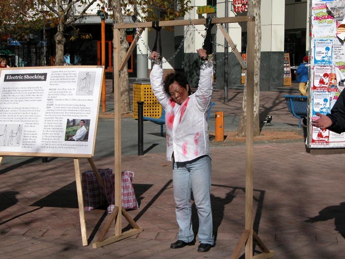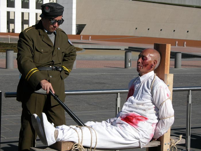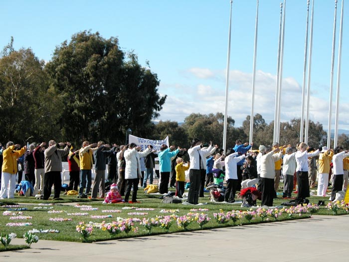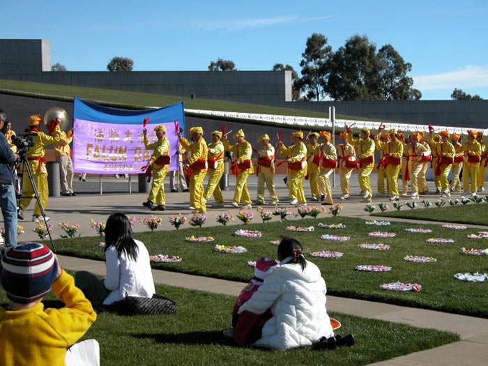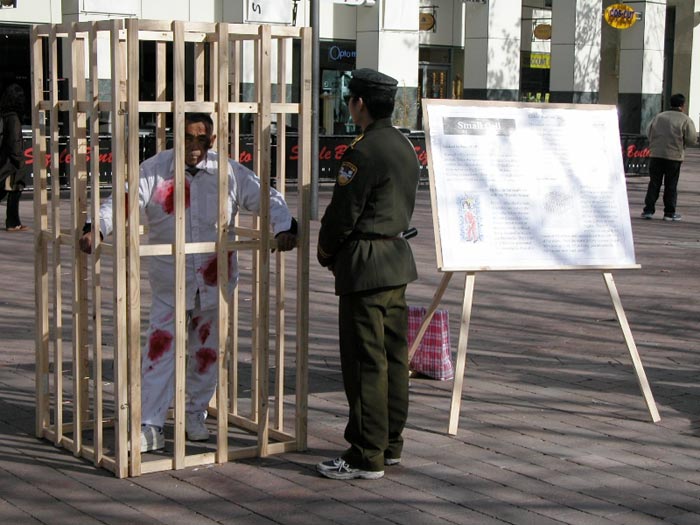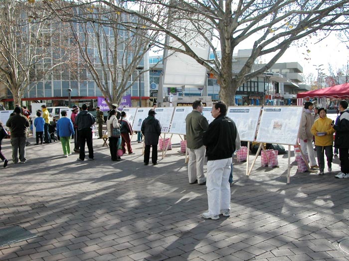 自1999年7月20日以来,中国江氏犯罪集团发动了对信仰真、善、忍的法轮功学员惨无人道的血腥镇压与迫害。江氏集团用造谣与欺骗手段進行诬蔑宣传,企图掩盖事实真象、蒙蔽中国及全世界人民。为了让人们進一步认清江氏对法轮功学员的迫害、揭露邪恶谎言,澳洲法轮功学员在堪培拉市中心和唐人街举行了酷刑展。酷刑展示同时,学员進行功法演示,展现大法的祥和美好。