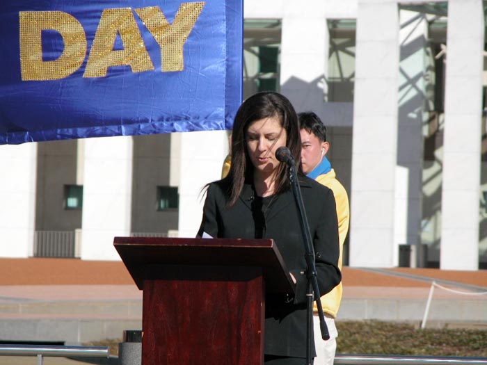 应邀参加庆祝活动的民主党上议员娜塔沙。代斯帕佳的代表宣读了她的简短声明:“我衷心祝贺第四次庆祝澳洲法轮大法日的成功。民主党一直非常关注中国法轮功学员遭受迫害,我们也在国会上提出一个动议,就是要求澳洲政府行动起来,要求中国政府停止对澳洲公民的亲人由于修炼法轮功而遭受的迫害。我相信民主党会继续和你们一起面对和解决法轮功(受迫害)问题。 ”