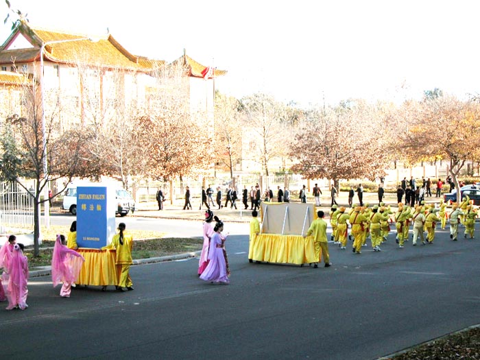 超过10位以上的国会议员对澳洲法轮大法日表达了祝贺。庆祝活动中法轮功学员演唱了多首他们发自心底的歌曲。腰鼓队表演的阵阵鼓声响彻云霄。游行队伍从国会前出发缓缓走到中国驻澳洲大使馆前,“法轮大法好”的旗帜在灿烂的阳光下闪闪发光,整个游行队伍充满着庄严、和平的气氛。路上的游人和中国游客被这一场面震撼着,争相拍下照片。