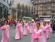 “法轮大法好” 的歌曲悦耳动听,不停的在街头回响,伴随着这优美的旋律,法轮功学员们翩翩起舞。有的路人站在路上观看,好久不愿离去。有一群当地的年青人和着音乐的节拍大声的随着唱起了 “法轮大法好”。“法轮大法好 ,法轮大法好……” 的歌声此起彼伏。