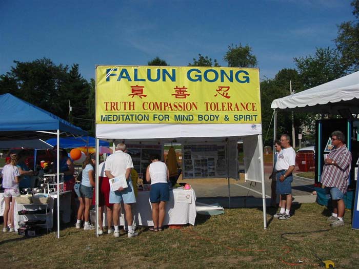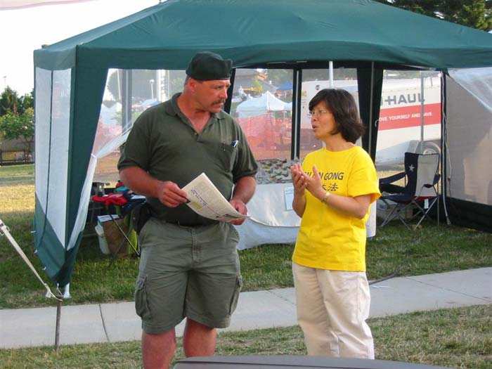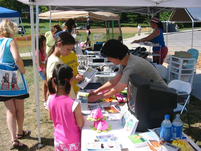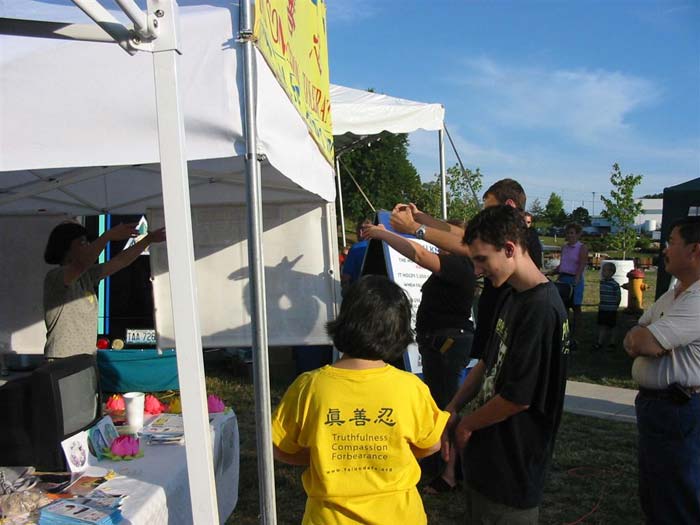 游行结束后许多观众来到鲍尔温公园法轮功学员的展位,進一步了解法轮功真象。他们无不为中国江氏集团残酷法轮功感到震惊。一些人当场学炼了法轮功五套功法,还有许多人来了解炼功点情况。不少游客特别是孩子们过来学做莲花,这朵朵莲花是为纪念被迫害致死的大陆法轮功学员而做。还有人热情的跑来报喜,告诉法轮功学员获得了“鲍尔温日游行最佳花车奖”。