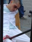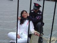 过往的人们纷纷驻足,仔细了解法轮功的真象。在真人展示的酷刑前,在每一块图片展板前,始终聚集着人群。许多人仔细的读着图片说明及发给他们的真象资料,为了看清位置比较低的图片,许多人弯着腰,或者蹲下来看。人们是如此仔细的,急切的想了解,到底为什么在中国发生这样残酷的事情。