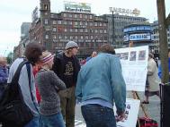 由于时间正值夏季旅游季节,来到哥本哈根的各国游客非常多,人们向学员们索要不同语种的材料。来自中国的游客,也有许多默默的接过真象资料和光盘,许多人在重新思考,认识这场迫害的真实情况,重新再做判断。许多人长时间与学员交谈,或在征签书上签名,或静静的听学员用扩音器讲真象。