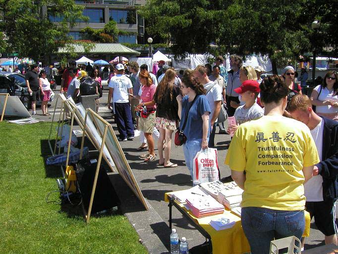 在3位中年华人妇女看完展示后,学员上前询问她们是否知道这些情况。她们回答说,她们周围没有法轮功学员,因而不了解。学员告诉她们,江氏集团一直在掩盖这样的真象。她们说,如果公众知道真实情况,一定不能容忍的。