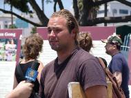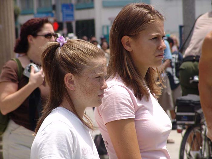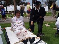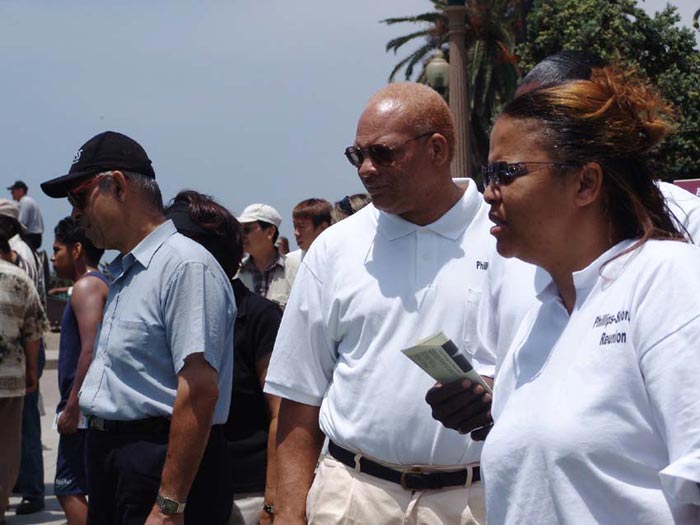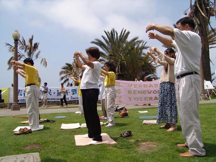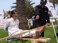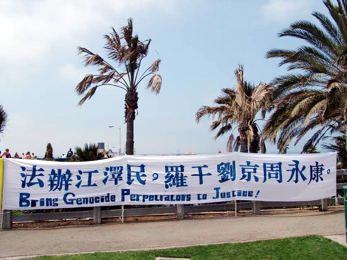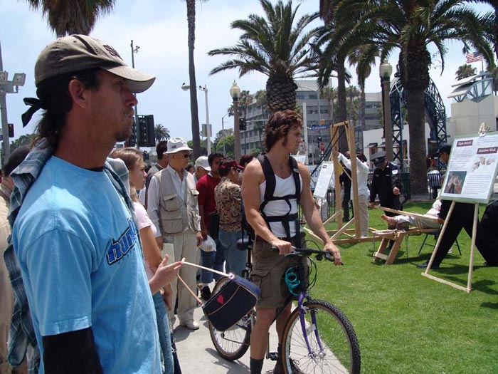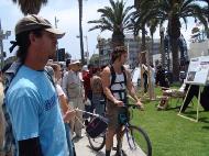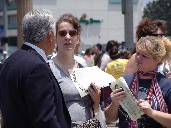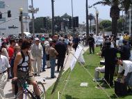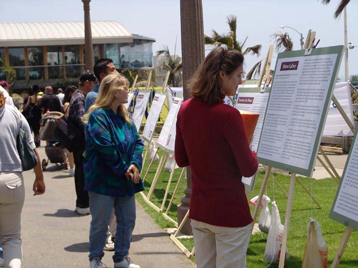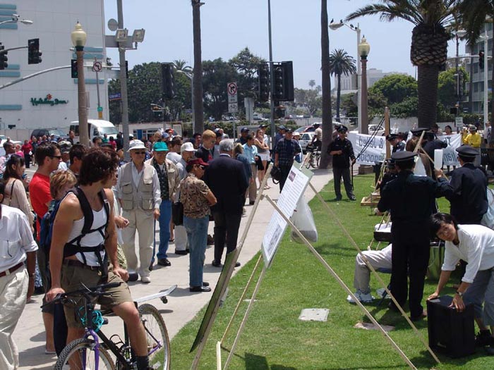 【明慧网2004年6月28日】圣塔莫尼卡海滨是洛杉矶著名的旅游圣地。2004年6月26日星期六,游人如织,当地学员在这里演示大陆法轮功学员被残酷迫害的实景,引来众多民众围观,反应十分强烈。