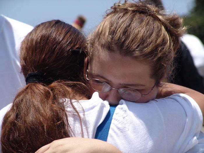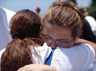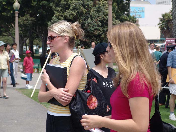 两位年轻的姑娘看完酷刑演示和展板,又找现场的学员了解更多真象。听完学员讲大陆法轮功学员的苦难故事,两位善良的女孩伤心的默默相拥,泪流满面。