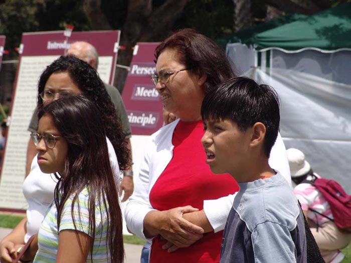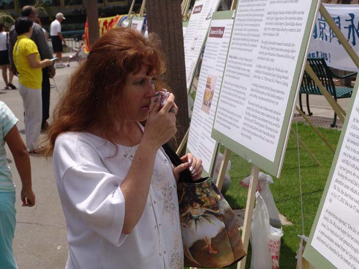 一对带着女儿的夫妇说,他们一家都是基督徒,看到法轮功学员遭受的酷刑,使他们想起基督教曾经遭受的迫害。他们的12~13岁的女儿边看边啜泣着。