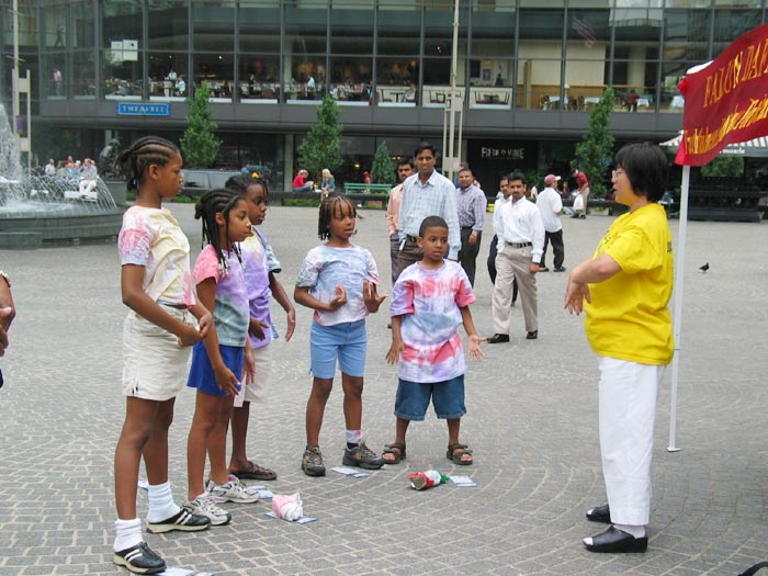 发生在中国的迫害引起了人们的关注有缘人当场学炼法轮功Fountain Square位于市中心,许多上班族中午来到这里吃午餐,匆匆而行的路人中很多都停下来观看这些酷刑照片,很认真的、表情凝重的阅读展板的详细内容,并向学员询问更多迫害的真象。当得知这些法轮功学员只是因为和平的炼功就遭到这样的酷刑折磨,几乎所有的人都感到愤慨和难过,许多善良的人询问如何能够帮助,并很乐意的在寄给布什总统的呼吁美国政府帮助制止迫害的明信片上签名,一些人还主动拿明信片要给朋友去签。很多人和学员交谈后,由衷的感谢学员告诉他们这些,并鼓励学员说,你们在做一件很好的事,这是个非常好的展示,祝你们好运。
