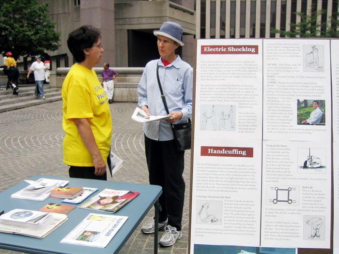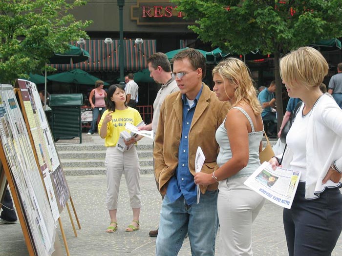 有一位男士在展板前长时间的仔细阅读了每个展板,后来向学员介绍说他曾是大赦国际的成员,表示愿意去联系当地的大赦国际寻求帮助,并提供了一些当地人权组织的联系方式。一些有缘人在了解真象后对法轮功功法产生了很大兴趣,向学员询问在哪里可以学炼法轮功,更有人当场开始学炼起来。