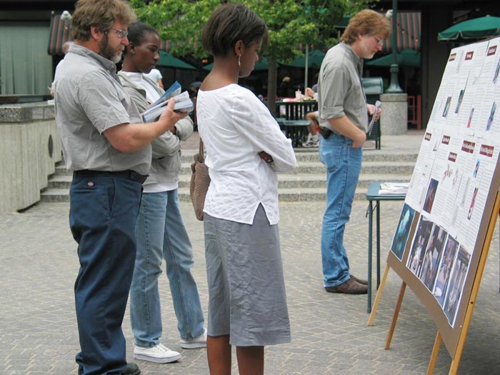 【明慧网2004年6月29日】2004年6月25日,俄亥俄州辛辛那提市法轮功学员在“国际反日”来临之际,在市中心广场Fountain Square举办酷刑图片展,揭露江泽民对法轮功学员的残酷,得到当地市民很大的关注和支持。