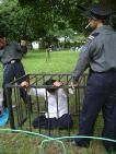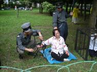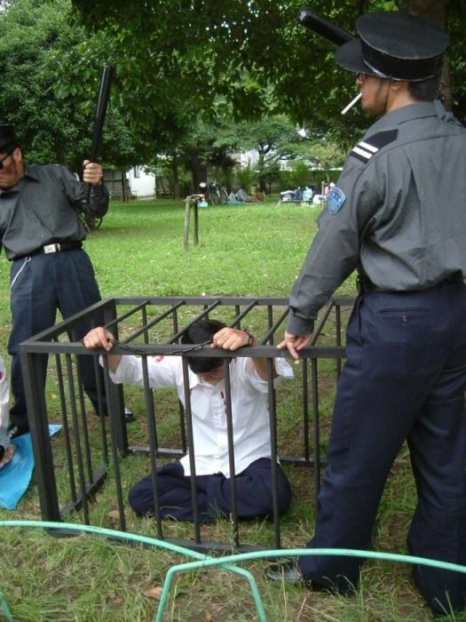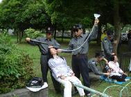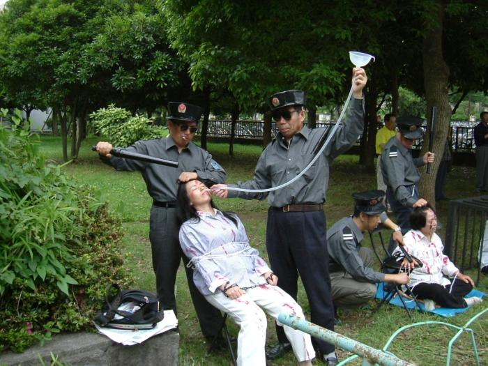 60多岁的法轮功学员伊藤女士扮演了“ 手指插竹签”的角色,她告诉记者说∶“这些警察的帽子是我和另一位老太太一起做的,因为没有经验,做了拆,拆了做,做了好几回才合适,老太太的手都起出血泡来了。但我们觉得很值得,因为我们想给人们以真实的再现,光发报纸、让看图片还不够。得让他们看到大陆大法弟子是怎么受刑的,给他们留下深刻的印象。这江××也太不像话了,怎么能这样虐待人呢?”当记者问她一天里同一角色一个姿势,您一个老人家不觉得辛苦吗?她干脆的说∶“只要让路过这里的人们了解在中国发生的对法轮功的这个迫害我就挺高兴啊,就是这么个想法。我们老太太也能做些讲清真象的事,心里觉得踏实些。”
