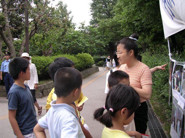 有两位二十岁左右的残留孤儿的后代,先是不解的问这是怎么回事?当法轮功学员指着一幅幅百种酷刑图向他们解释后,他们说:“这么残忍的事发生在中国呀,真是难以置信啊,我们知道了。”当法轮功学员叮嘱他们要记住法轮大法好时,他俩点头并接过真象报纸说:“我也是中国人。”
