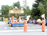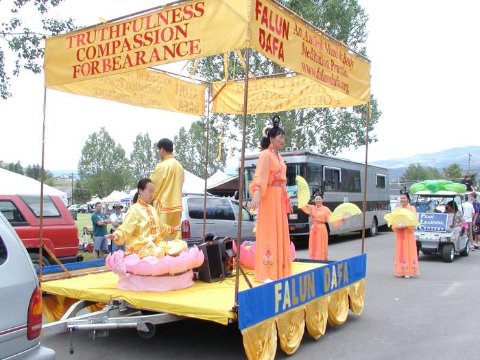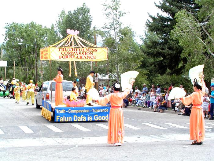 【明慧网2004年6月29日】2004年6月27日,科罗拉多州中部安静的雄鹰山镇(Eagle), 迎来了一年一度的雄鹰飞翔节游行。科罗拉多州的法轮功学员们也在游行中。腰鼓队打头阵, 花车功法表演, 扇子舞, 吸引着人们的视线。雄鹰镇的人们倾城而出, 纷纷主动索要法轮大法的宣传资料。