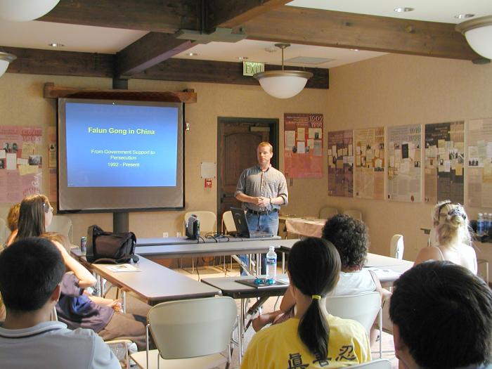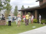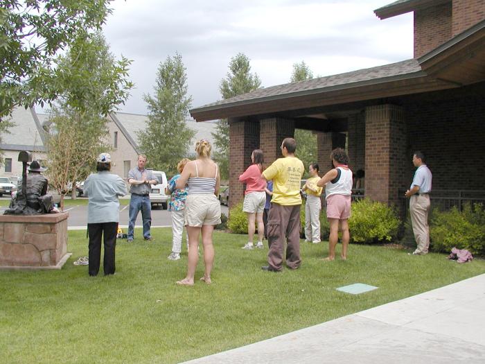 游行后, 学员们在(Eagle) 雄鹰镇的图书馆内教功和介绍了法轮大法, 也向前来学功的人们介绍了法轮大法在中国受到的情况。参加者有老人, 也有小孩, 大家还时不时的提问, 最后, 在圆满的气氛中, 大家在图书馆外的草坪上, 学习了五套法轮大法功法。