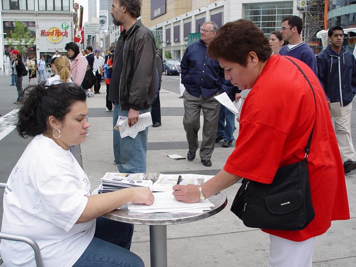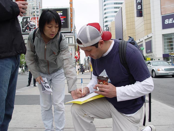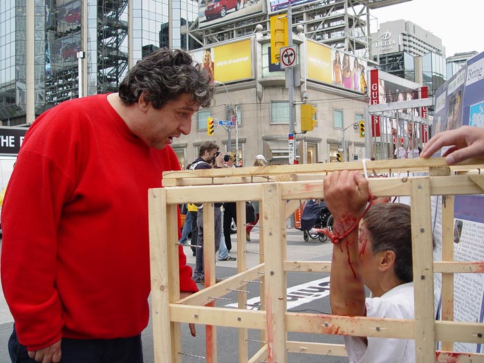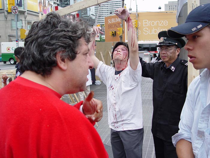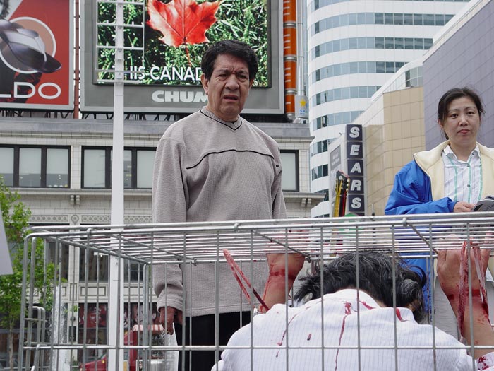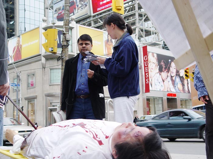 【明慧网2004年6月30日】5月28日多伦多法轮功学员在多伦多最大的商业中心对面的广场上向世人展示中国法轮功学员所遭受的部分