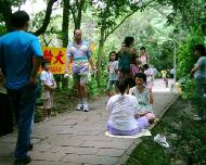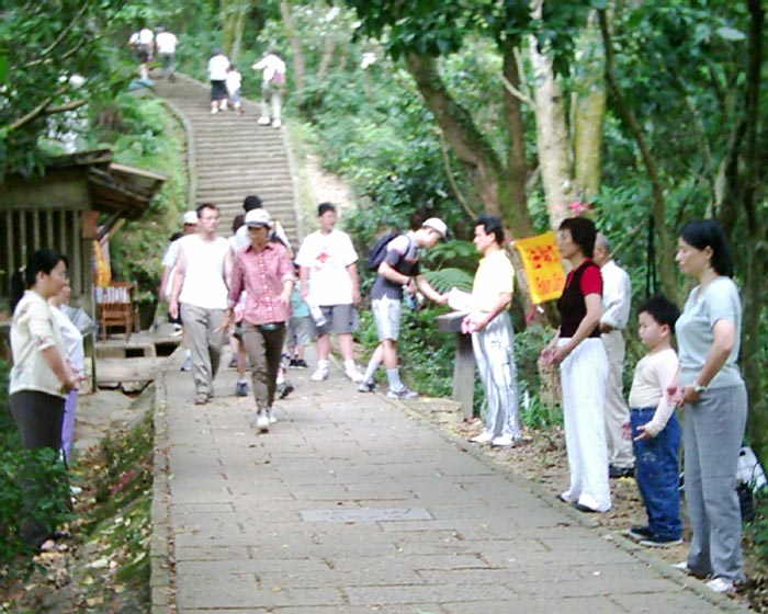 松山四兽山景致清静怡人,假日期间,许多爱好登山健行者或一家人出来游玩,皆会前来这里登山游憩,男女老少都有。我们在登山步道两边炼功,一、二位学员散发法轮功材料。