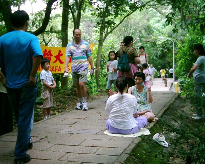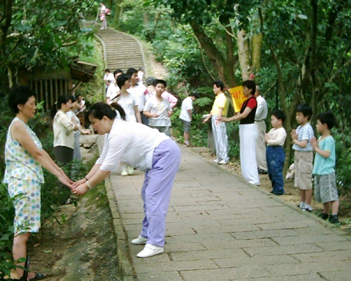 还有在炼静功时,听到下山与上山的人不期而遇的对话,上山的人说:“他们坐在地上干什么?”下山者说:“他们在炼法轮功啊!法轮功很好啊!”