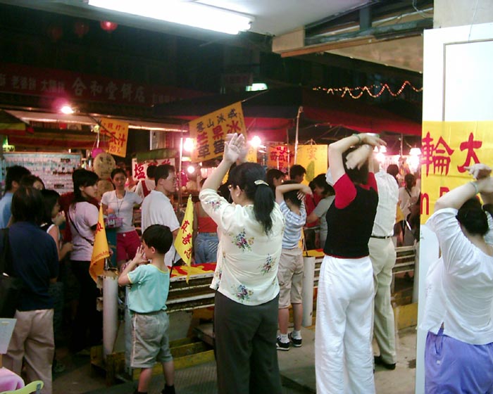 在饶河观光夜市租借一个店铺门口当展位,此地光线很好,我们在门前炼功,一旁挂上“法轮大法好”横幅,并插上小三角黄旗,墙柱上也挂上小横幅。此处是游客必经之处,吸引许多民众前来观看,又不影响旁边做生意的店家。几日之后想与老板续租,老板说已经有人租一个月期了,原来之前租不出去的地方,我们在这里炼功洪法后,竟一下租出去了,说明我们炼功时周围会出现一个祥和的能量场,让经过的人感到一股祥和之气。师父说:“我们炼功时周围会出现一个场,……他是讲慈悲的,他是和宇宙真、善、忍特性同化的……”(《转法轮》),所以我们炼功时产生的能量场会使周围的人受益。