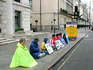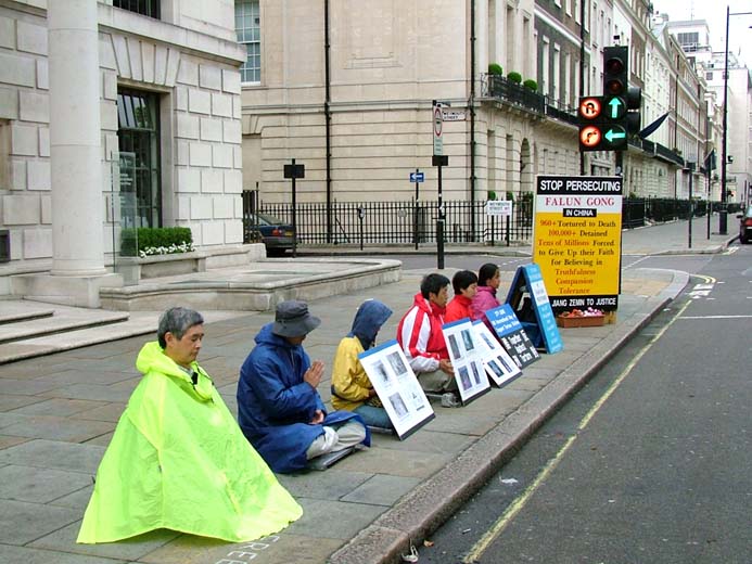 法轮功学员们像往常一样,在中使馆前炼功、发正念、讲真象。同时,大家还展示了中国法轮功学员在劳教所、监狱、看守所等地被关押时,所遭受的各种酷刑折磨的图片。过往的行人都驻足仔细观看图片和阅读文字说明。有些甚至主动与学员攀谈,以了解更多的真象。