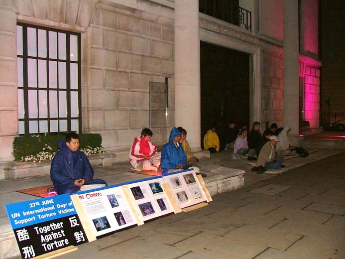 午夜12点,当法轮功学员们一起在中使馆前加入了今天最后一次全球发正念后,结束了一天的请愿活动。