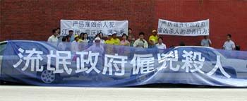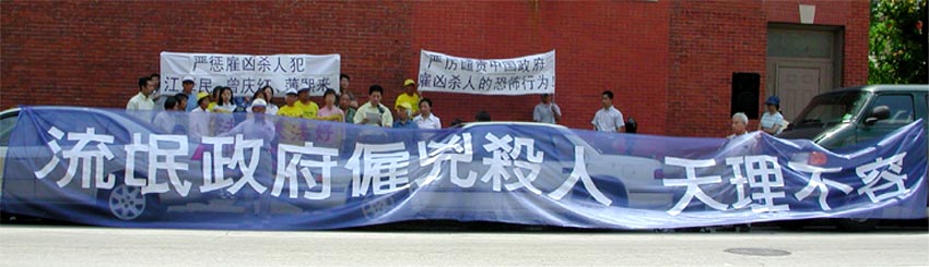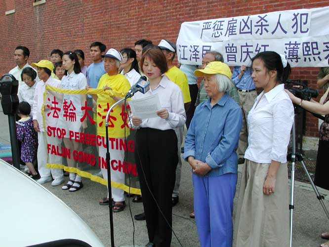 新闻发布会上,学员们打出了分别印有“严惩雇凶杀人犯江泽民,曾庆红,薄熙来”“流氓政府雇凶杀人,天理不容”和“法轮大法好”的巨大横幅。并用中英文反复解说法轮功学员被枪击事件并谴责江氏集团海外雇凶杀人的恐怖行径。