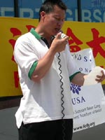 2004年6月29日中午,近150名大纽约地区的法轮功学员来到中领馆前召开新闻发布会,强烈谴责曾庆红、薄熙来一行在海外雇凶杀人,以恐怖凶杀手段对付和平请愿的法轮功学员的行径。