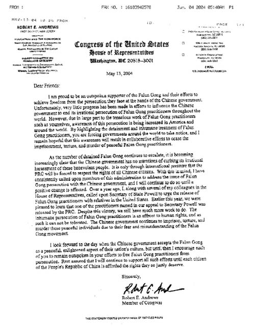 安德鲁斯议员说,不幸的是,在全世界为敦促中国政府停止对法轮功的无理迫害的努力仍然不够。但是,由于你们的不懈努力,人们在美国和全世界越来越了解这场迫害。你们通过揭露对法轮功学员的监禁和不人道对待,来督促世界各国政府关注,我希望对迫害的认知将促成联合力量制止这场对法轮功学员的监禁、折磨和屠杀。