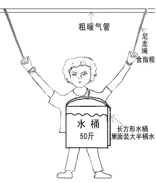 又过了半个多小时,我的两只手臂就失去知觉了。当时还想:怎么就不疼了,还以为是放下来了,抬头一看手依然吊在空中,桶依然吊在脖子上。就觉得恶心,喘粗气,这样迫害持续了近四个小时。当把我的手放下来的时候,整个胳膊任何知觉都没有了,东西拿不起来,过了半个月手才能拿东西,半年之后才渐渐恢复。