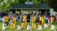 ![]() 位于公园入口处的法轮功学员展位 | ![]() 多名法轮功学员在舞台前的草坪上演示法轮功五套功法 |