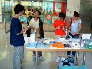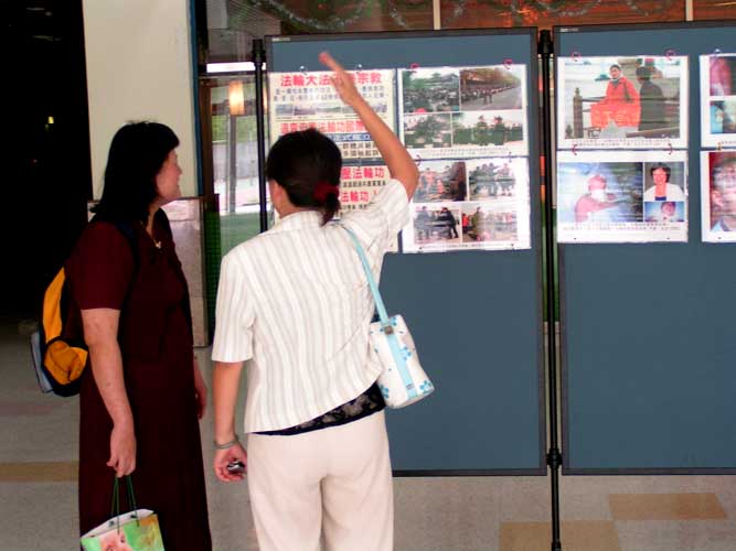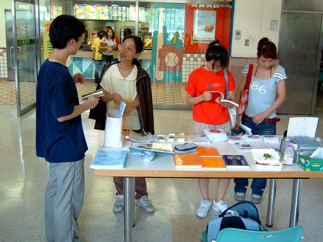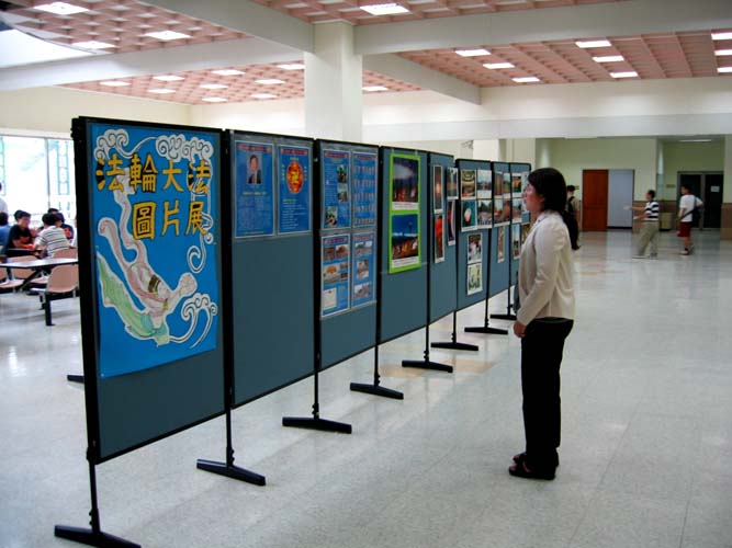 踏入活动中心,便可听到一曲名为「普度」的优美旋律回荡其中,使熙来攘往的人群似乎增添了几分平和。走到麦当劳前广场,一整排精美的法轮大法海报映入眼帘,前面还有社团的资料展位,提供许多介绍法轮大法的精美书签、资料及VCD等让人免费索取,许多师生走到这里总不由得被这些书签所吸引。学员在海报展的另一端播放功法介绍及法轮功真象影片,许多人驻足观赏后明白了真象。有两位学员每天从中坜前来义务帮忙,向许多师长、同学导览并详细介绍法轮功。