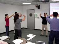 八位来自板桥的学员身着黄色T恤,在餐厅广场進行功法展示。学员整齐画一的动作配合着悠扬祥和的炼功音乐,吸引了许多人的目光。其他学员在一旁发放资料,并進一步介绍法轮大法。晚上学员在图书馆视听中心放映室举办了两个多小时的功法教学,参加者均觉得炼功后身心舒畅,手心并有热热、麻麻的感觉。一位硕士班研究生表示他从小就健康不佳,看了很多西医、中医都没有改善身体状况,今天炼功后感觉很好,想要继续学炼。与他同行的另一位研究生,当天学打坐时能直接双盘,动作学习很快。还有一位长庚医院X光科医师也前来学功,并询问早晨炼功时间。活动结束后,学员均提供了《转法轮》等书籍让他们借阅。