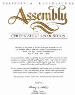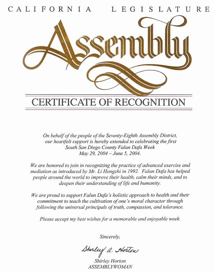 嘉奖证书谨代表第78选区的居民,我们向2004年5月29日至6月5日首届南圣地亚哥郡法轮大法周的庆祝活动表达衷心的支持。