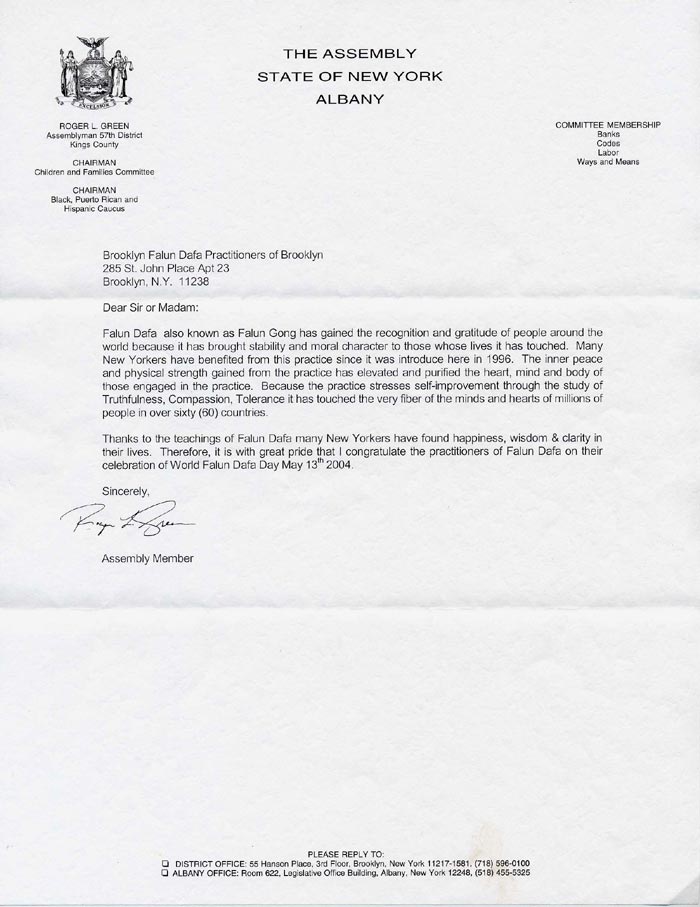 他说,由于法轮大法的教导,许多纽约人已在生活中找到快乐、智慧和方向。因此,我很自豪的祝贺法轮大法学员于2004年5月13日庆祝世界法轮大法日。