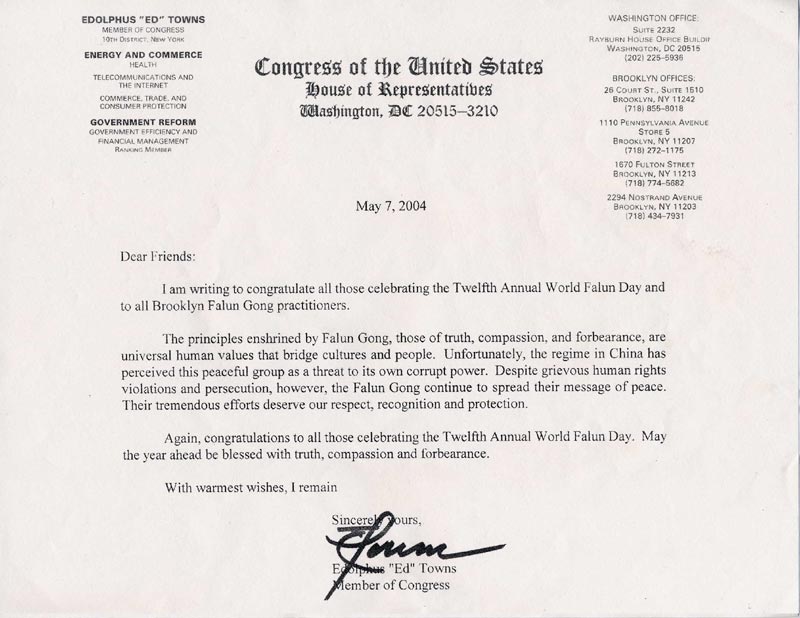 唐斯议员在信中说,法轮功信奉的真、善、忍法理是人类的普世价值,他架起了文化和人类的桥梁。遗憾的是,中共把这一和平的团体视为对其腐败权力的威胁。面对严重的人权践踏和迫害,法轮功继续传播和平的信息。他们的巨大努力值得我们的尊敬、承认和保护。