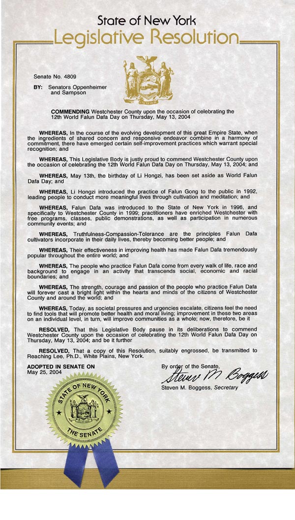 鉴于,参议院自豪的嘉奖威斯特郡(Westchester County)2004年5月13日星期四世界法轮大法日的庆祝活动;并且