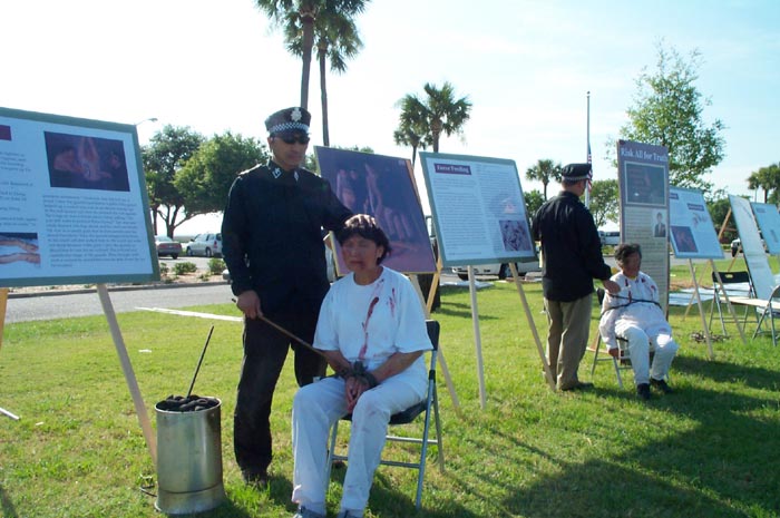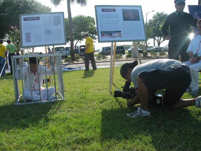 法轮功学员吕先生演示被关在笼子里双手被铐的场景,他在笼子里蜷缩坚持了三个小时,他的手腕已经有了红色的勒痕。他说:“虽然我被关了3个小时,被太阳晒,被蚂蚁咬,弓着身,双手被铐,但是跟国内的法轮功学员包括我太太所遭受的迫害相比,这点苦根本不算什么。他们遭受40多种惨无人道的酷刑。不仅如此,他们还遭受精神折磨,被强迫洗脑,那种精神上的痛苦比肉体折磨更让人难以忍受……”