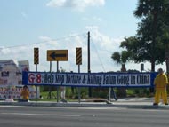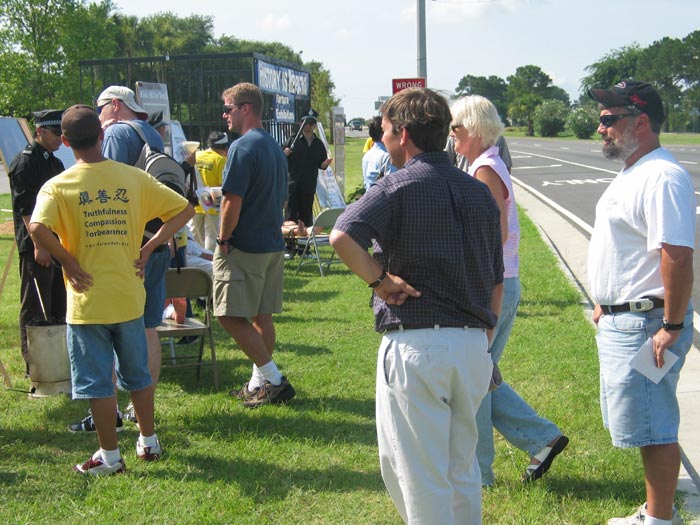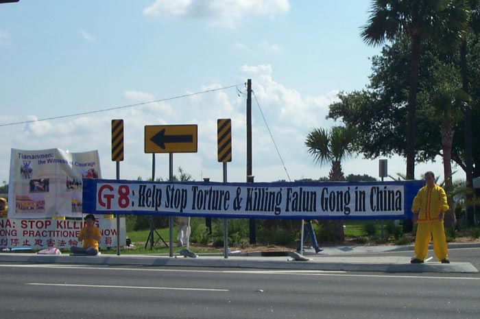 附近一家中餐馆的老板把她的大门口让出来,让学员们炼功、举横幅、作酷刑展示等,给学员们提供各种方便。她是一位70多岁的老太太,听学员介绍法轮功与法轮功受迫害的情况后,拉着学员的手说:“你们都是好人。我知道,你们都是好人,我支持你们。”