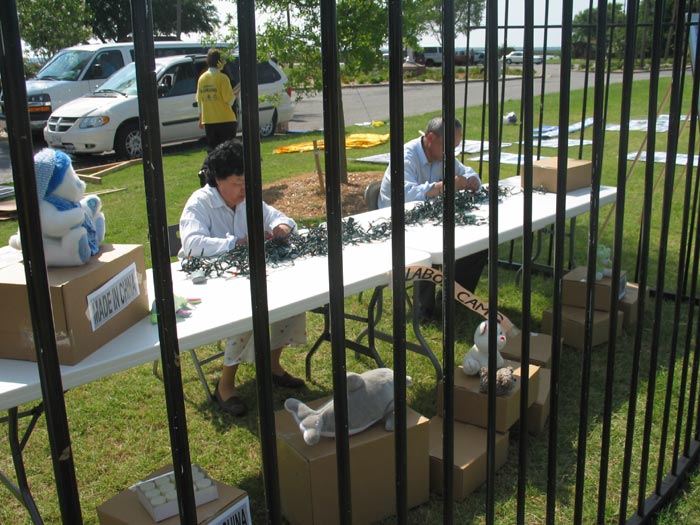 法轮功学员龚先生和龚太太在铁架里演示法轮功学员在中国监狱里被强制做奴工产品的场景。周围摆着电灯泡、玩具等奴工产品。龚太太表示她曾经被非法关押在中国的劳教所里遭受各种折磨,其中包括被强制做筷子等奴工产品。
