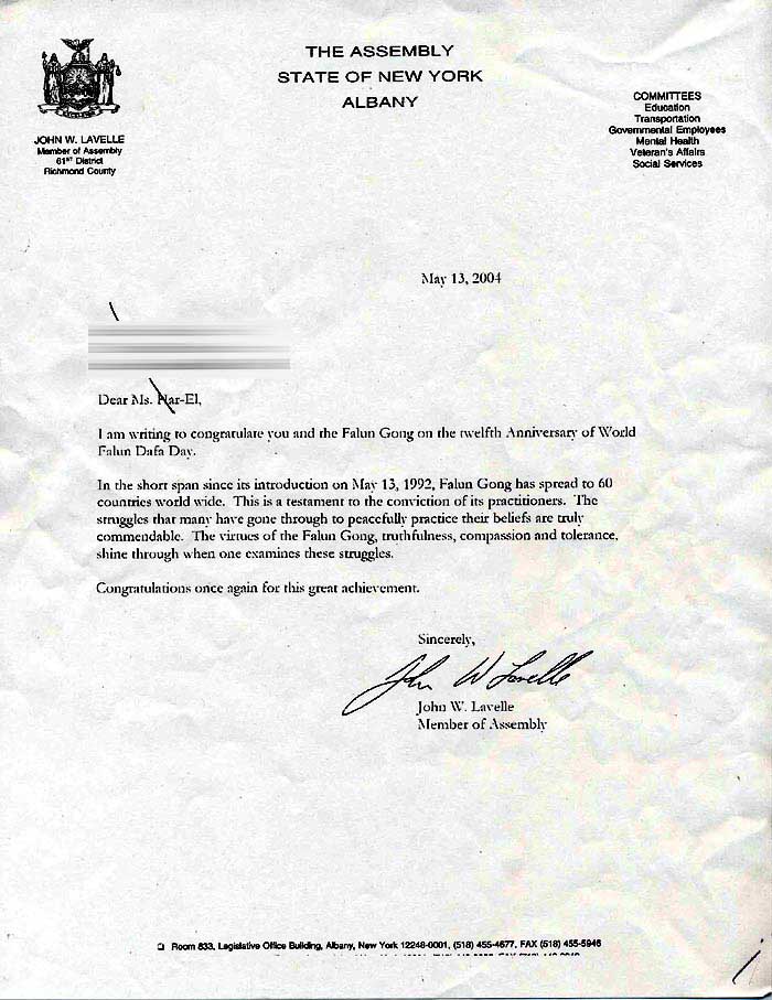 拉维尔议员说,自1992年5月13日以来短短的时间内,法轮功已经传播到世界上60个国家。这是法轮功学员信念的见证。法轮功学员为和平的信奉他们的信仰所做出的承受实在值得嘉奖。这些承受透射着法轮功的美德“真、善、忍”的光焰。再次祝贺法轮功所取得的这一伟大成就。