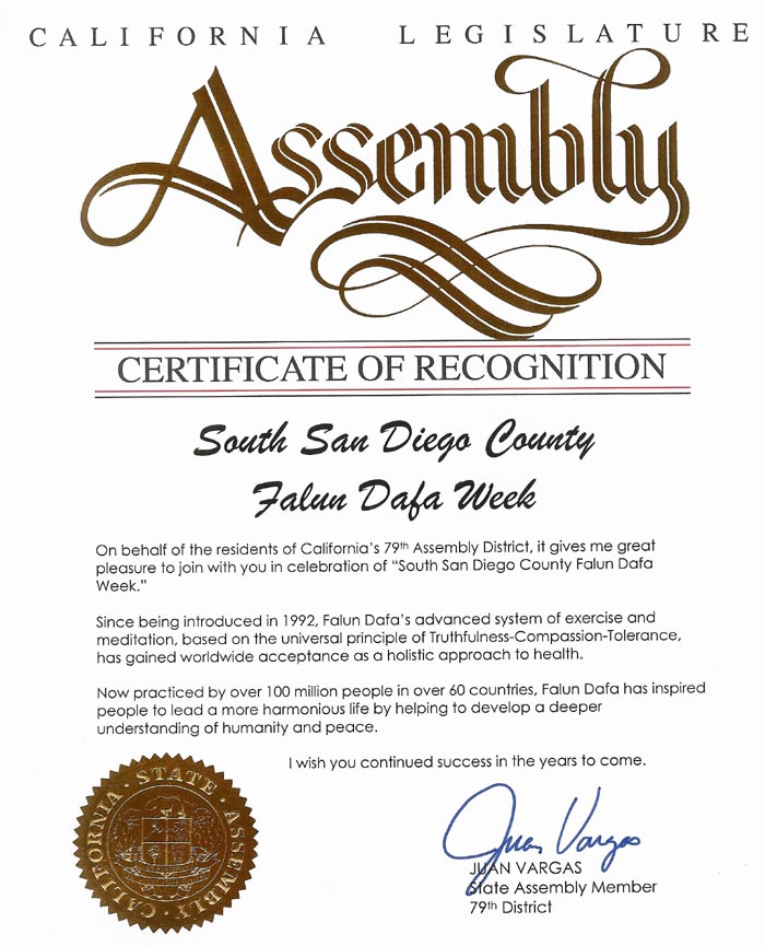 谨代表加州第79选区的居民,我非常高兴和你们一起庆祝“南圣地亚哥郡法轮大法周”。