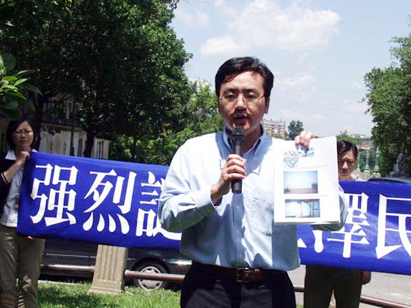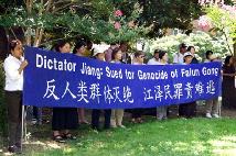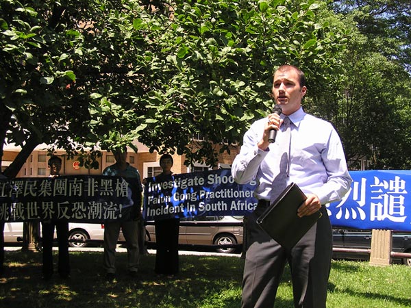 几十名华府法轮功学员在中国驻美大使馆前打出了“强烈谴责江泽民集团南非雇凶杀人”,“江泽民集团南非黑枪挑战世界反恐潮流”,“调查法轮功学员南非遭枪击事件”,“反人类群体灭绝江泽民罪责难逃”等中英文横幅。