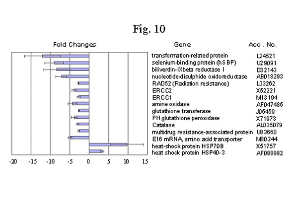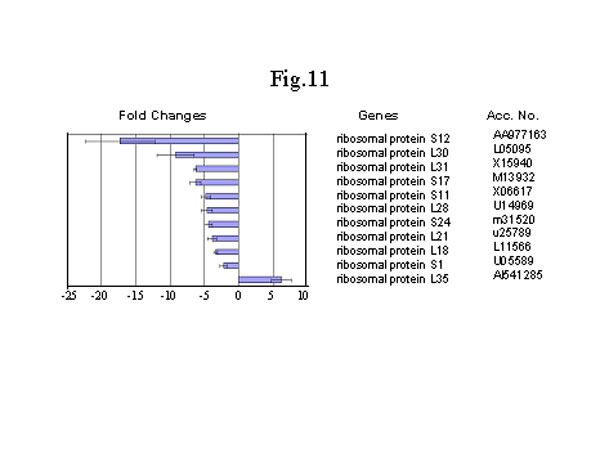其它下调控的基因包括,参与蛋白质合成的基因,DNA修补的抗氧化酶。主要的抗氧化酶,过氧化氢酶和谷胱甘肽过氧化氢酶,也减少了(图10)。这些与紧张刺激相关的关键酶的减少,以及其它受紧张刺激调控的基因下降,意味着氧化物的生成和大分子的破坏减少,这些基因包括酵母基因在哺乳动物体内的同源基因RAD52(抗辐射)和ERCCs(切除修补)。核糖体是蛋白质合成中重要的成分,而11个核糖体基因中10个下降说明蛋白质合成也可能下降(图11)。令人意想不到的是,两个热休克蛋白质,HSP70和HSP40-3,却显著上升, 这与其它对紧张刺激有关的基因的下降恰恰相反(图10)。 这些紧张刺激调控基因反向调控的分子机理还需要進一步确定。但对于类似这些热休克基因,研究是否可以通过上调控来起到保护作用是应该很有意思的。有证据表明这些热休克蛋白可能对心脏确有保护作用[84]。