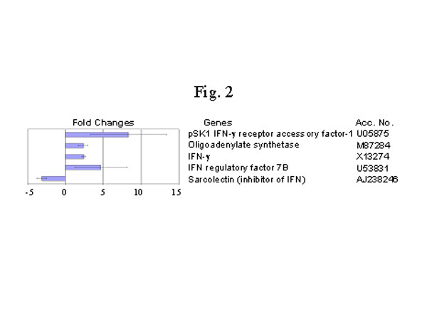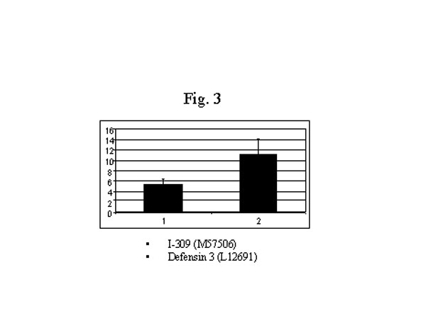 最近,我们用DNA微排列技术比较了修炼人(n=4) 和非修炼 (n=4) 的健康人嗜中性白细胞的基因表达状况,我们发现修炼人的嗜中性白细胞的基因表达的超常变化,此外还有明显的功能上的变化。我们使用Affymnetrix 的载有12,000个探针的基因芯片发现了有众多的基因在表达水平上有相当大的改变。其中有两倍以上变化,并在所有修炼人的白细胞中都有变化的基因有 485个。235个基因的变化在6个修炼人呈不一致变化(有的上升有的下降,可能与个人修炼状况有关)。有意思的是,其他250个基因呈同向变化,132个基因上调控,另外118个基因呈下调控。上升的基因多和免疫功 能有关(图1),如抗微生物的小分子肽-防御素(Defensin-3, L12691)增加了6.7 倍 (图3),干扰素及干扰素相关的、和受干扰素诱导的基因都明显增加,而干扰素的抑制因子,Sarcolectin 却明显下降[48](图2)。很明显,调控趋势是干扰素的功能增强。抗微生物的小分子在生物防御系统中起着非常重要的作用,哺乳动物的防御素是属于体内表达量最高的广谱抗菌素,在嗜中性白细胞中尤其高[49]。防御素-3(A型防御素)是一种带负电荷的小分子肽, 起着一种非氧化物性杀伤微生物的作用。A型防御素通过裂解细菌的细胞膜起到一种先天免疫的作用[50,51]。最近,A型防御素被认为是最重要的抗爱滋病毒的小分子(脚注)。干扰素-gamma,也是一种非常重要的抗病毒等微生物的细胞因子[52]。干扰素可通过诱导其他因子来调控免疫反应[53]。对转基因小鼠和基因缺失小鼠的研究更進一步肯定了干扰素-gamma在免疫方面的作用[54,55]。这些基因的增高和功能方面的改变是相吻合的,嗜中性白细胞对细菌的吞噬和杀伤能力明显增强 (图4)。此外,I-309也明显 增加(图3)。 I-309 属于趋化细胞因子,它的受体是爱滋病毒的辅助受体[56,57],因此,I-309 可能起着抗爱滋病毒感染的作用。I-309在修炼者体内普遍升高可能是修炼者对爱滋病毒有抵抗力的重要原因之一(根据一项未发表的文章)。当然,防御素的增加可能是抗爱滋病毒感染的另外一个因素(脚注)。