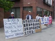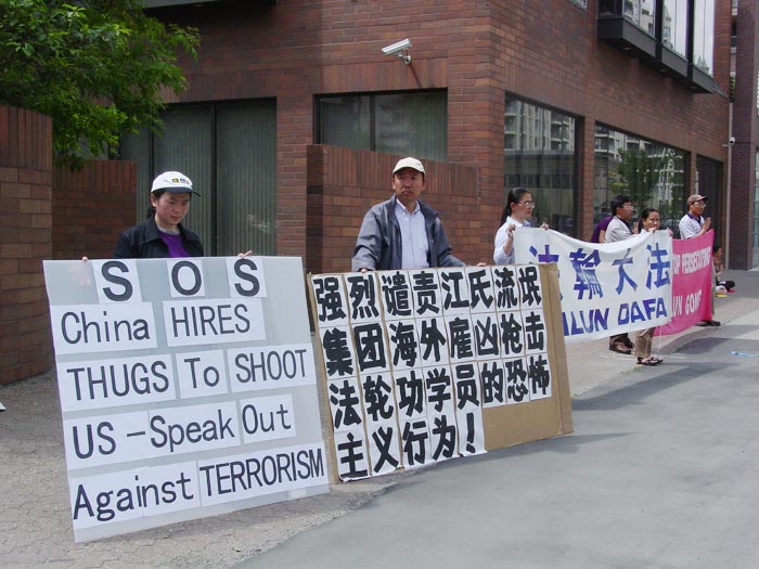 ![]() 打横幅,谴责雇凶枪击事件 | ![]() 领馆前静坐,法轮功学员和平请愿 |