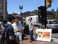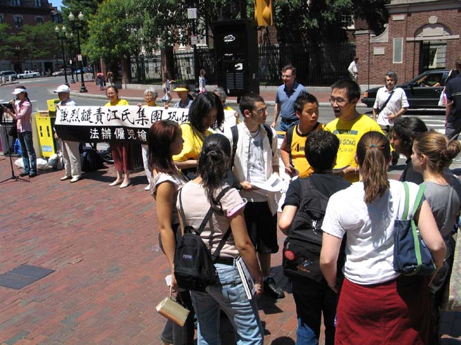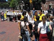 哈佛广场位于剑桥市中心,比邻著名的哈佛大学和哈佛地铁站,中午时分是人们外出午餐的时间,人流量极大。在新闻发布会期间,很多人驻足观看,了解真象。
