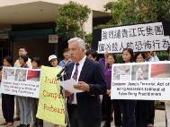 法轮功学员在现场打出“强烈谴责江氏集团雇凶杀人的恐怖行为”、“制止虐杀 制止迫害”、“信仰自由”等标语,并展示中枪受伤学员和被枪击损害的汽车图片。多位法轮功学员发言,讲述了枪击事件的经过,谴责江氏集团把国家恐怖主义扩展到海外的罪行。