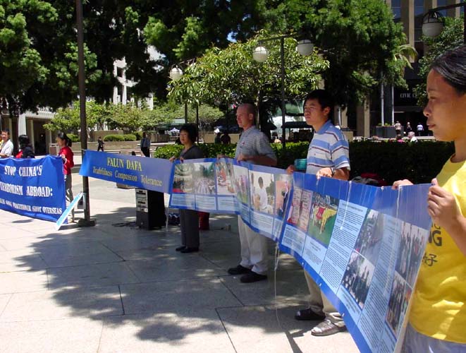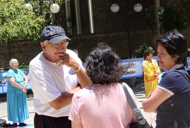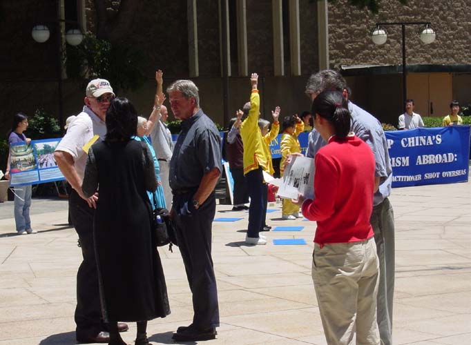 在新闻发布会上,学员还向观众和来宾表演了五套法轮功功法。许多途经新闻发布会现场的市政府工作人员和市民纷纷领取真象材料,了解情况。还有的人表示要到炼功点学习法轮功。一位观众说,他和一位中国大陆明星的父母是朋友,他表示一定会把法轮功在圣地亚哥市的情况和今天新闻发布会的情况转告这位明星及他的父母,并希望他们支持法轮功。