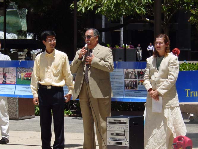在学员发言后,国立市(National City)议员路易斯-纳提维达(Council Member Louie Natividad)发表讲话。路易斯-纳提维达说道,“我在多种场合看到过你们,在游行中、在杂志上、在录像里。我也曾经和你们中的成员交谈过。我今天要说的是,我支持你们所做的一切,我支持你们在世界各地所做的一切。我反对任何想要阻止你们的人,任何人。”他说,“中国政府的行为是恐怖主义者所为,他们的所作所为证明了这一点。如果今天有中国政府的人在这里,我敢告诉他们这些,我不惧怕他们。在这个国家我们有自由,在这个国家我们讲自由。”路易斯-纳提维达议员最后说道,“我今天来就是要告诉你们,我和你们站在一起,我要帮助你们,我要成为你们的朋友。”
