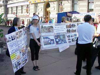 【明慧网2004年7月10日】2004年7月8日,在圣彼得堡的市中心(涅瓦街),法轮功学员们举行了和平的抗议活动。此次抗议活动主要呼吁停止正发生在中国对法轮功学员的残酷和折磨,并谴责其把中国国家恐怖主义扩张到其他国家的罪恶行径。其中包括谴责在南非共和国发生的枪击事件。数名澳大利亚籍的法轮功学员在南非准备起诉两名中国政府官员的途中遭到枪击,一名学员中弹受伤。