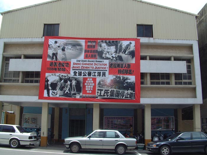 在会场外及台南启聪学校的外墙还挂出了法轮大法洪传世界及大陆江氏集团酷刑虐待法轮大法学员的图片,并以大银幕播放相关影片,请现场观看的民众了解法轮大法“真、善、忍”的法理所带给人们的美好并发出善心同声谴责江氏集团迫害法轮大法的暴行。